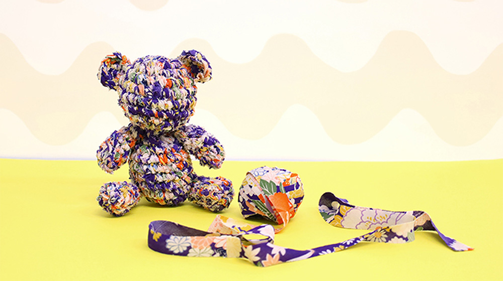 「ベアキット」はそんなキモノヤーンを使った、小さなクマのあみぐるみを制作できる手芸キットです。お客様の思い出の着物で作ったオーダーのキモノヤーンで制作するキットと、既存のキモノヤーンで制作するキットの2種類をご用意しました。