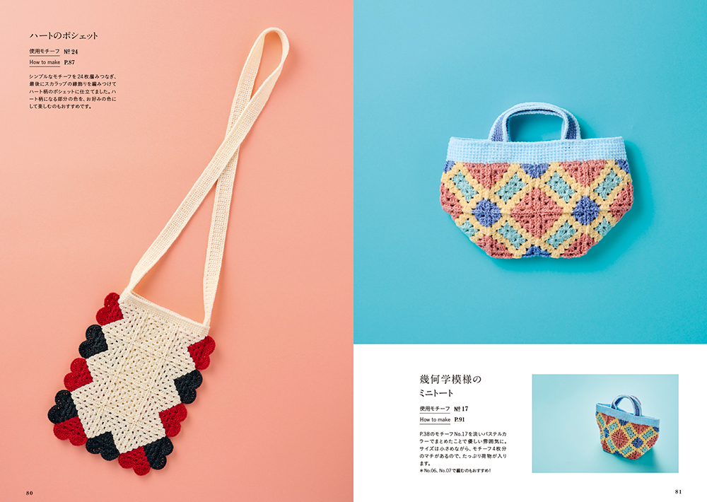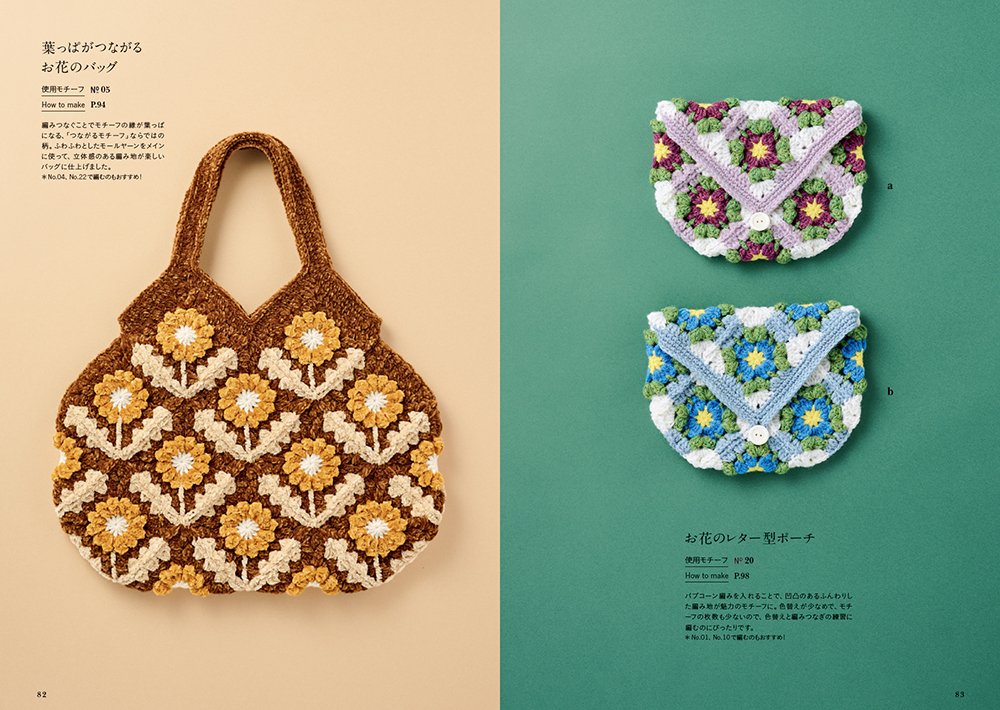 1つでもかわいいモチーフですが、色や糸、配置を替えると同じモチーフとは思えないほど印象が変わります。好きなモチーフを見つけて、作品を作ってみてください。編みものを始めたばかりの方も、ベテランニッターさんも、編んでも編んでもまだ足りない!と感じるはず。これぞ “あみだおれ三昧” な一冊です。
