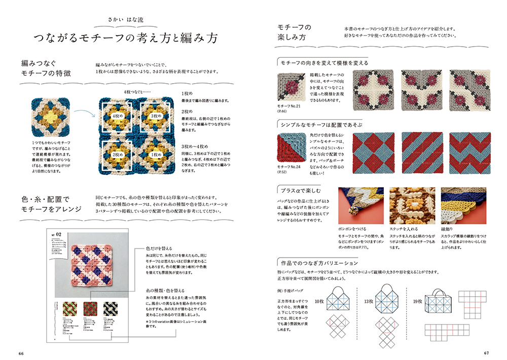 この本のモチーフは、4枚以上のモチーフを編みつなぐことで模様を描くのが特徴です。ベーシックな編み方ながら、配色と色の配置を変えることで、編みつなぐと浮かんでくる模様が大きく変わります。