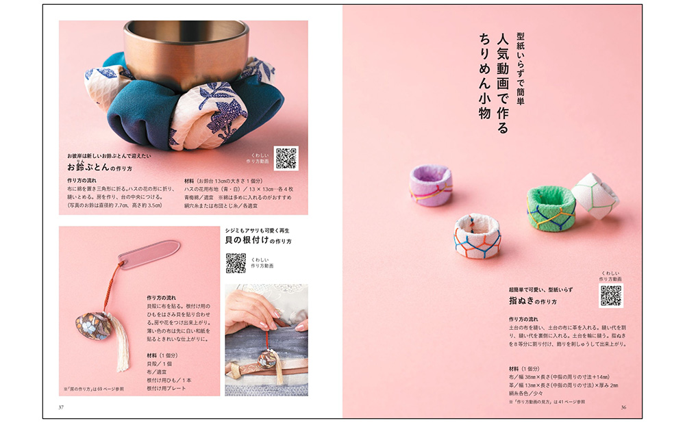 人気作品には、作り方動画を二次元コード付きで掲載しています。身近な材料で、ブローチやヘアアクセサリー、お守り袋など、素敵な小物を手作りできます。お友達やお孫さんへの贈り物にされる方も多いのです。伝承のデザインに発想を得た、最新作まで、バラエティ豊かな作品が満載です。
