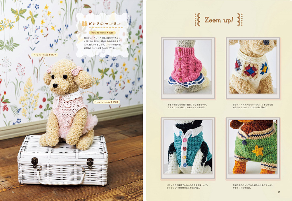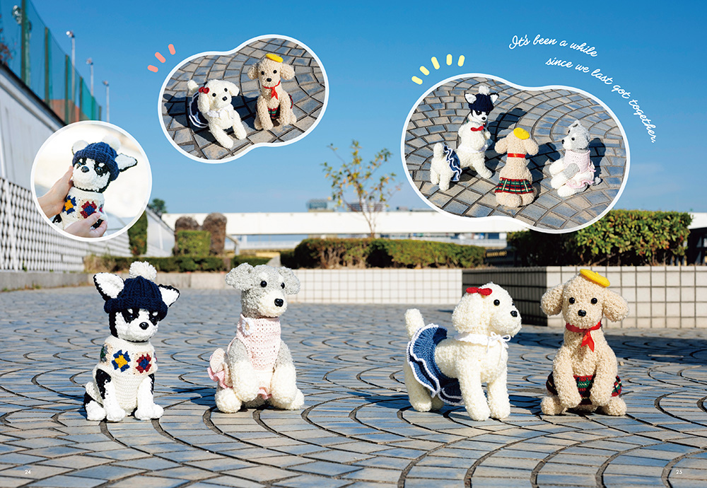 また、本書の著者・眞道美恵子さんの既刊『抱っこしたくなるあみぐるみワンコ』の作品にも着せ替えできるよう、サイズを調整しています。植毛タイプのワンコたちにも着回しができます。