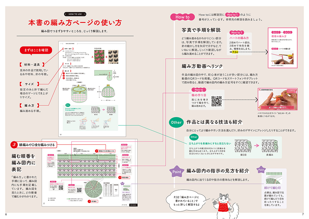難しそうに見えて挑戦できずにいた小物や、図が複雑に見えるフラワーモチーフ、いつかは編んでみたいウェアなど、編み図を見ていてつまずきやすいポイントが写真とイラスト、動画でくわしくわかります。
