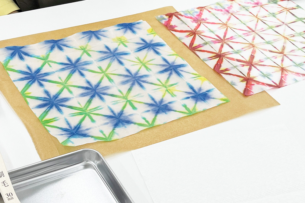 「折り染め」の技法で手漉き和紙を3枚染めます。