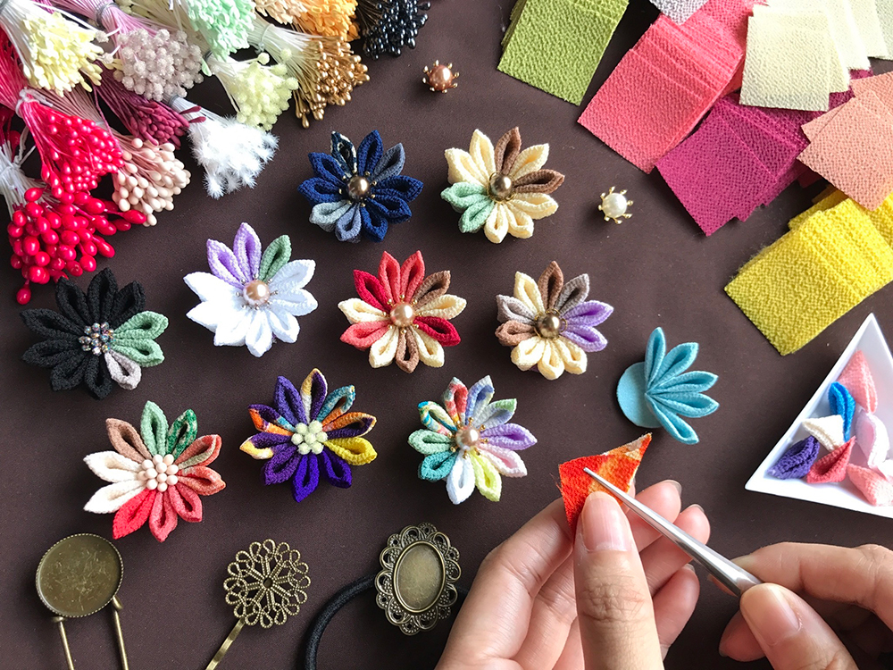 七五三や成人式の髪飾りのお花を作る伝統工芸を体験できます。